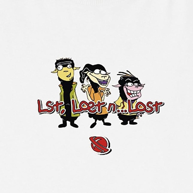 Camiseta LOST com meia malha penteada, fio 30/1, silk frontal, modelagem regular e etiquetas personalizadas.