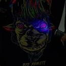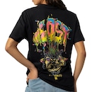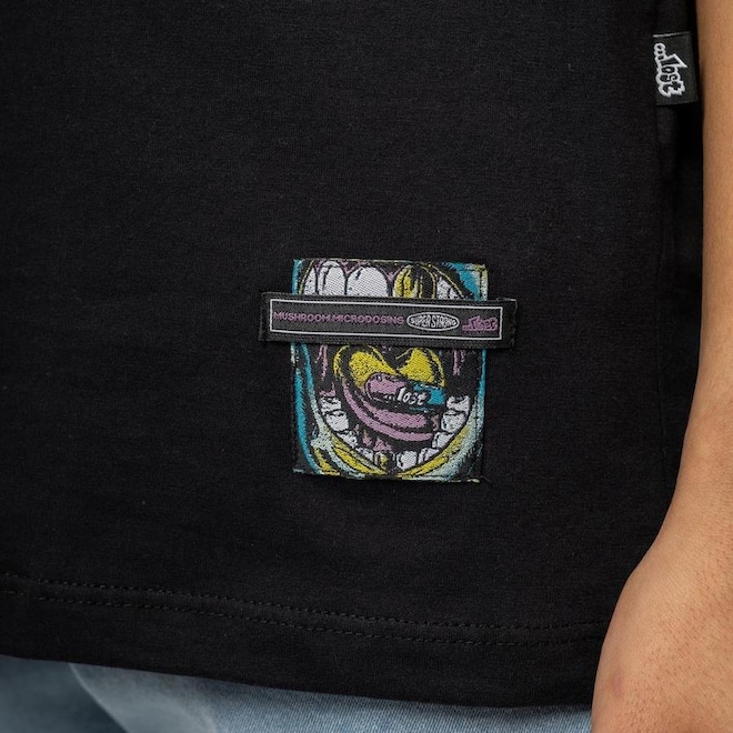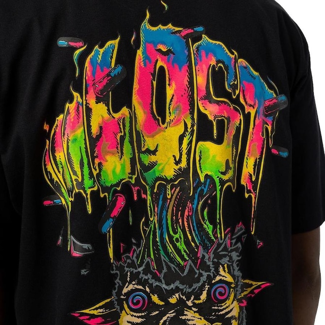 Camiseta Lost feita em meia malha penteada 30.1, modelagem regular, estampas localizadas no peito e costas, estampas em tinta neo que reagem à luz negra e etiquetas personalizadas.