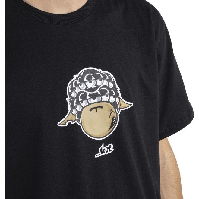 Camiseta LOST com tecido meia malha 30/1, modelagem regular, silk frontal e etiquetas personalizadas.
