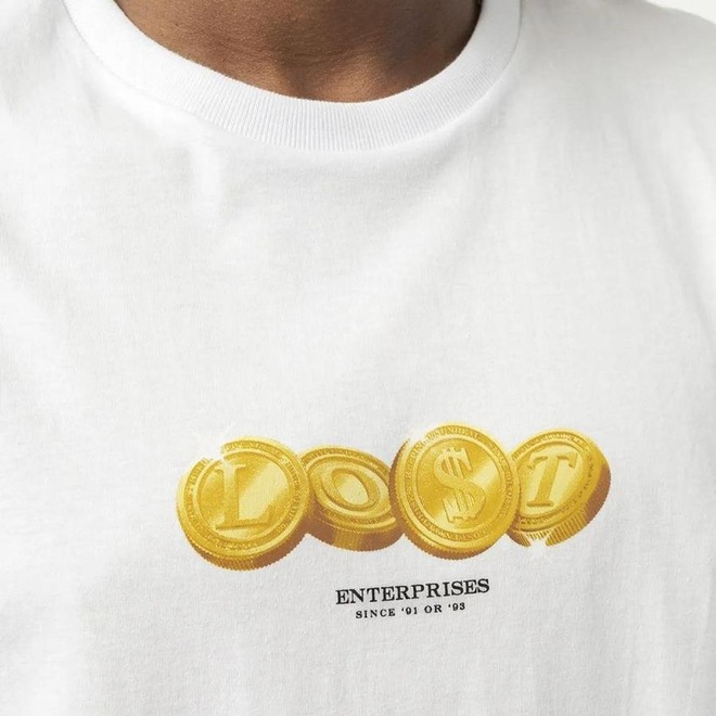 Camiseta Lost básica, meia malha 30.1, silk frontal, modelagem regular e etiquetas personalizadas.