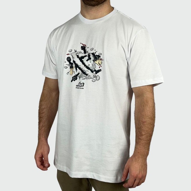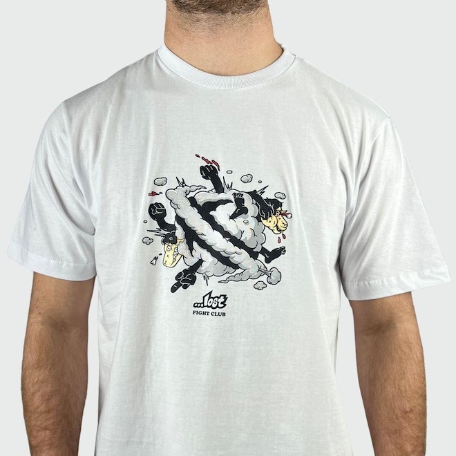 5 minutos sem perder a amizade? Uma peita que brinca com a logotipia da Lost em uma estampa rica em detalhes, muita fumaça e as sarcásticas ovelhas Lost em uma briga feia que vai acabar em risada e breja gelada.