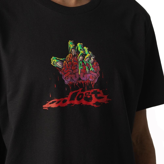 Camiseta Lost feita em meia malha 30.1, estampa frontal e costas e etiquetas personalizadas.