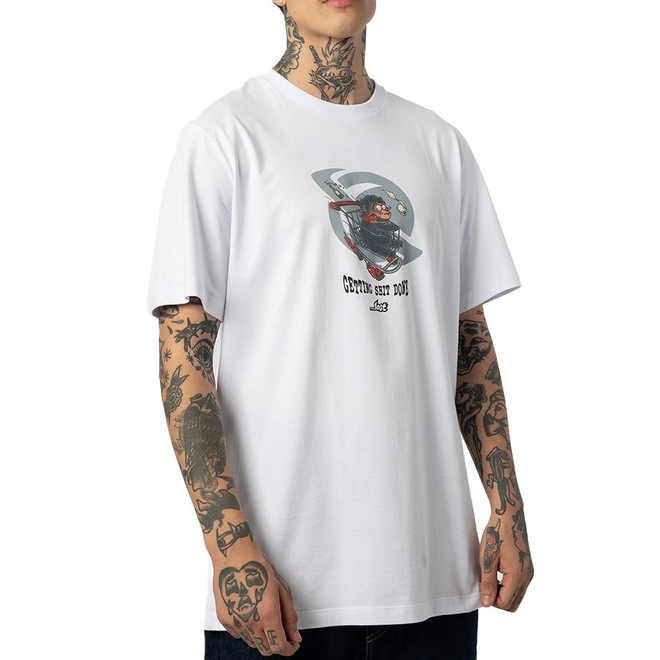 Camiseta Lost feita em meia malha penteada 30.1, estampa frontal e etiquetas personalizadas.