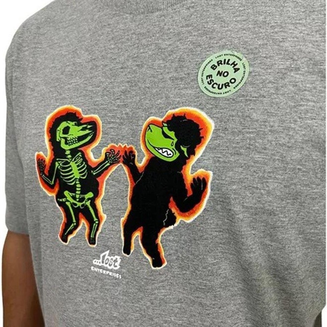 Camiseta Lost feita em meia malha penteada 30.1, estampa frontal e etiquetas personalizadas.