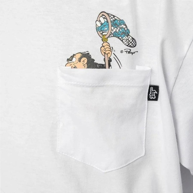 Camiseta Lost em collab com Os Smurfs, que conta com meia malha penteada 30/1, estampa frontal e trassira dos Smurfs, modelagem regular e etiquetas personalizadas da collab.
