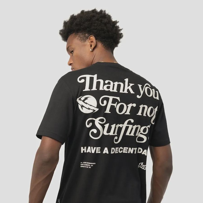 Design minimalista, cores que conversam e estampa clássica e elaborada, essa camiseta é um agradecimento especial aos pregos de carteirinha que desistiram de entrar no mar bem quando o swell gigante entrou. Tenham um excelente dia, a gente agredece.