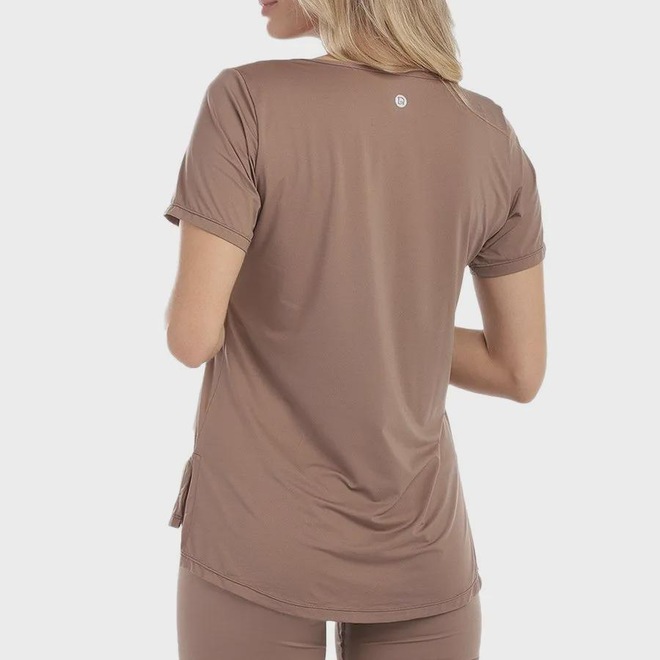 - Modelagem manga curta, com decote V, costas com comprimento alongado e ampla.