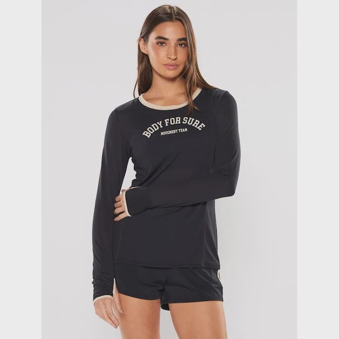 Camiseta manga longa com estampa localizada frontal, vivo frontal, gola em cor contrastante e tecido respirável exclusivo Body For Sure.