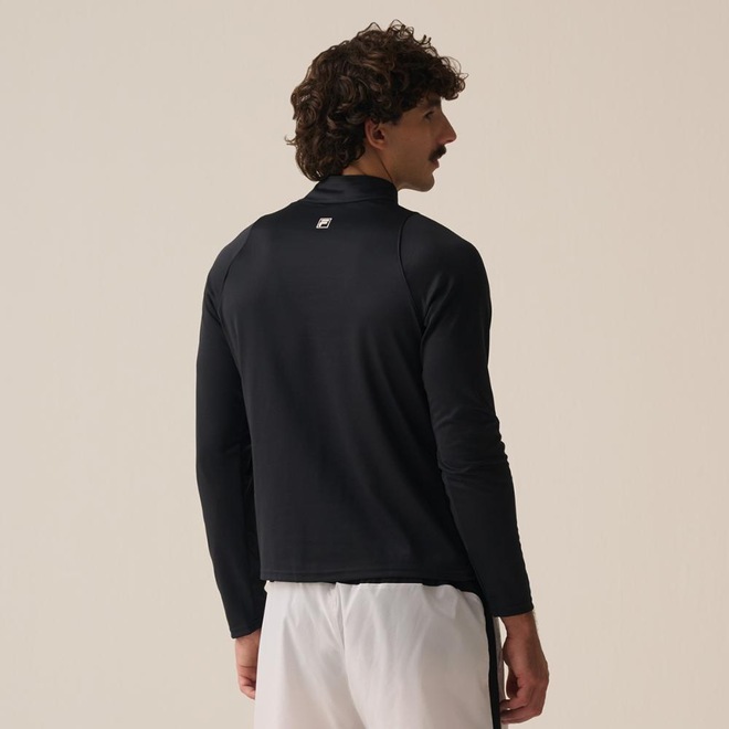 Camiseta masculina confeccionada em malha de poliéster com elastano. Modelagem slim fit, ajustada ao corpo, com gola alta e manga longa. Possui abertura frontal em meio zíper com puxador personalizado, aplique Fila Letter à base dágua localizado na parte frontal esquerda superior e aplique F-Box monocolor à base dágua centralizado abaixo da gola traseira.
