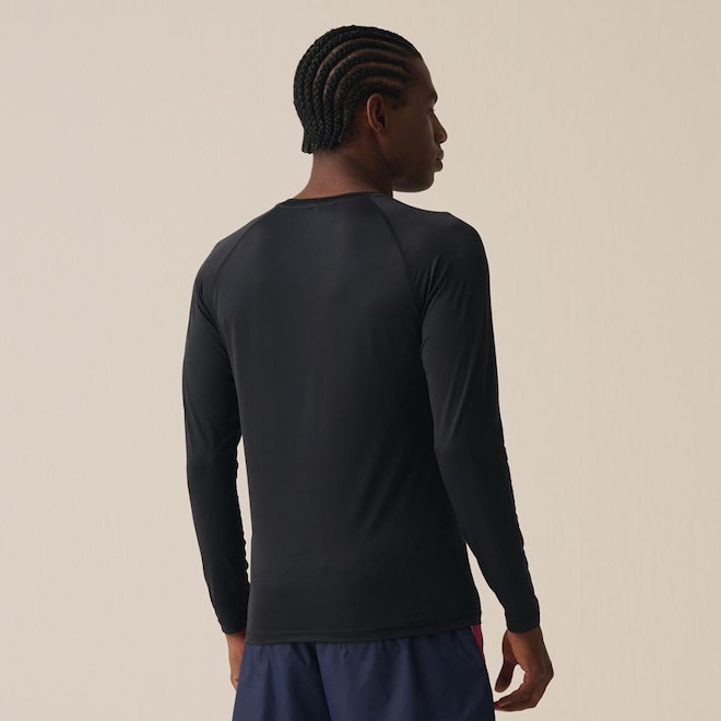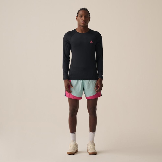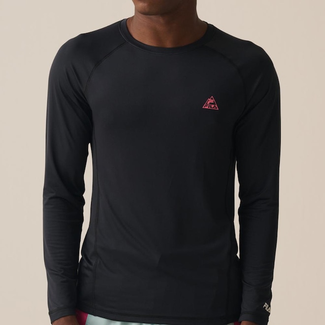 Camiseta masculina confeccionada em malha de poliéster com elastano. Modelagem slim fit, ajustada ao corpo, com manga longa raglan e gola careca. Seu tecido contém 2 tecnologias: FLOW, que oferece secagem rápida e mantém o corpo na temperatura ideal para a prática esportiva, e UV PROTECTION, que fornece proteção solar FPS 50+ dos raios UVA e UVB. Possui laterais deslocadas para frente, que proporcionam maior conforto e diminui o atrito com a pele, logo Fila Trek em termo aplicado na parte frontal esquerda superior e logo Fila Letter também em termo aplicado no punho da manga esquerda.ref: M17LYG