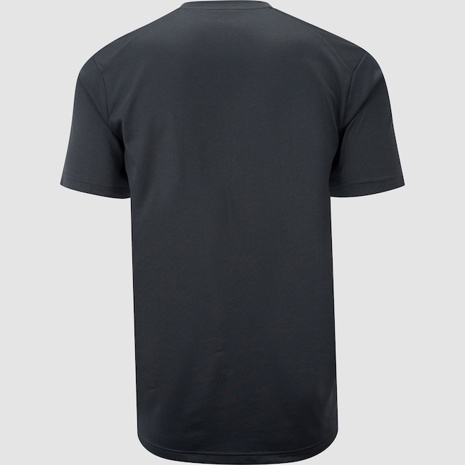 Conta com mangas curtas e sua gola é careca, canelada e tem tira interna.