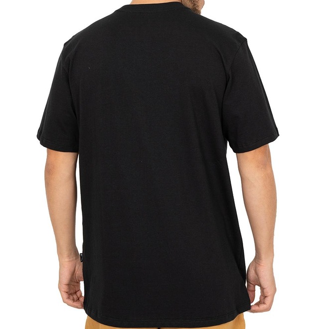 Camiseta Billabong feita em modelagem Corefit, meia malha, estampa aplicada na frente e etiqueta da marca aplicada na lateral do lado esquerdo de que veste.