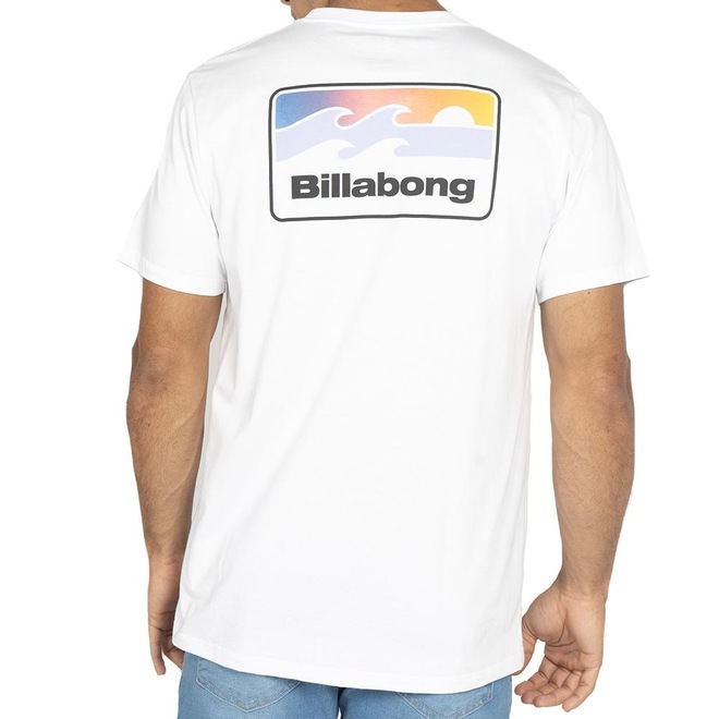 Camiseta Billabong feita em modelagem Core fit, meia malha, estampa 5 cores gradiente no peito e centro costas e etiquetas personalizadas.