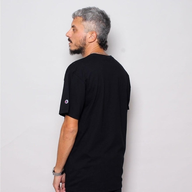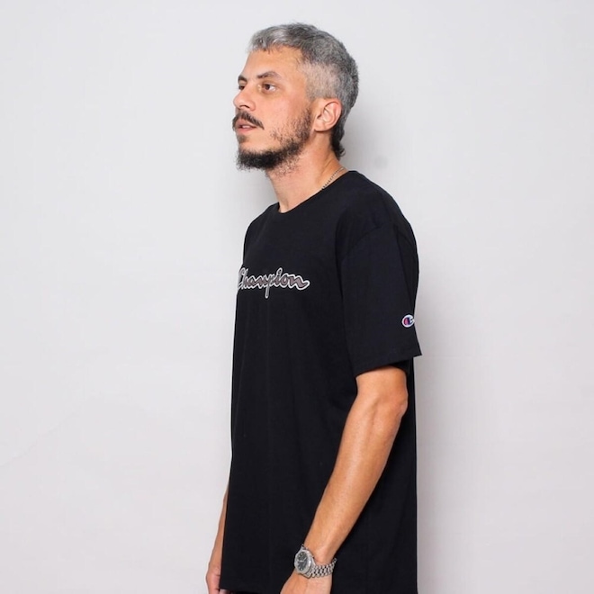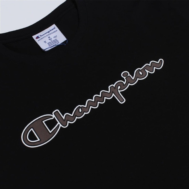 O grande diferencial está na logomarca "Champion" aplicada em estilo Script Metalizado, que confere um acabamento premium e moderno ao visual. Seu caimento é pensado para o dia a dia, com modelagem regular e gola careca, garantindo ajuste confortável ao corpo sem limitar os movimentos.