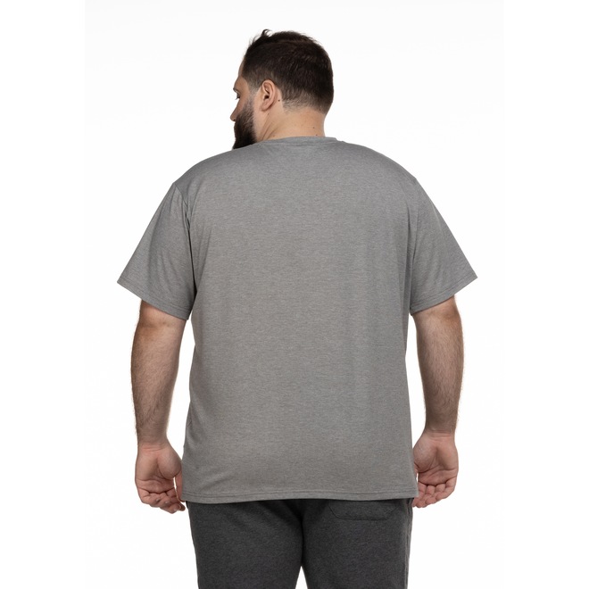 A camiseta masculina é em gola careca com tira interna em tecido que ajuda a diminuir o atrito de contato com a costura.