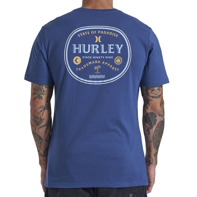 Camiseta Hurley feita em meia malha 30.1, gola rebatida, estampa localizada base d'agua e etiqueta clips ONE&ONLY na barra.