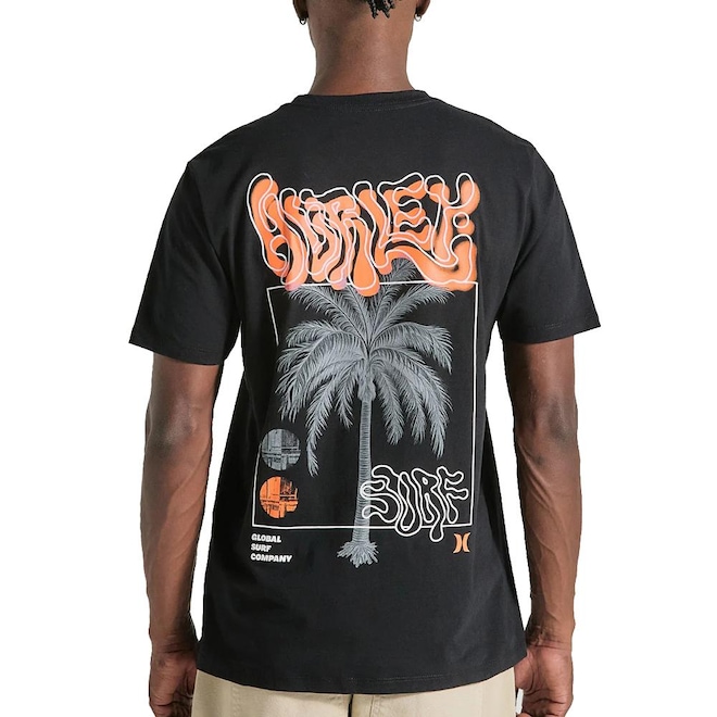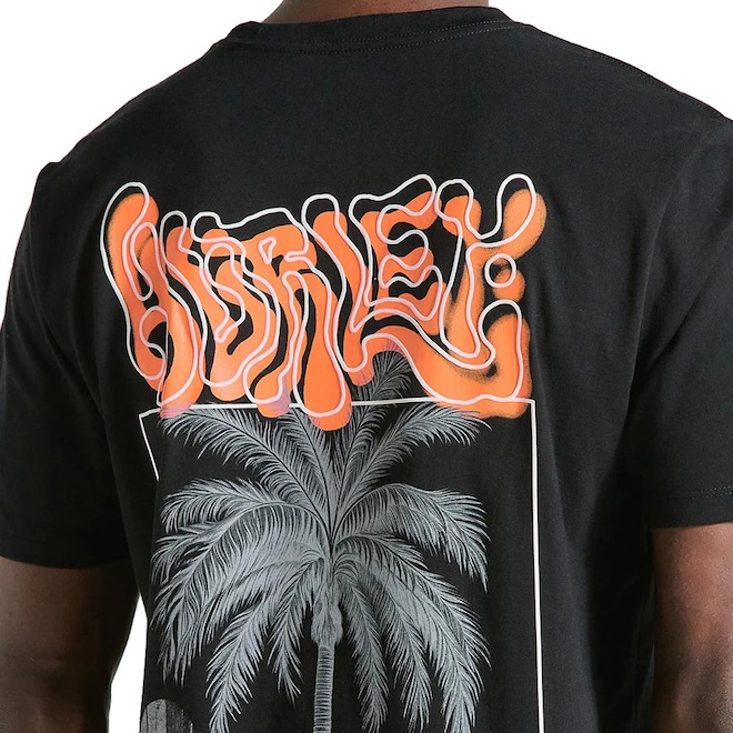 Camiseta Hurley feita em meia malha 30.1, gola rebatida, estampa localizada base d'agua e etiqueta clips ONE&ONLY na barra.