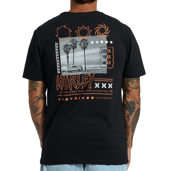 Camiseta Hurley feita em meia malha 30.1, gola rebatida, estampa localizada base d'agua e etiqueta clips ONE&ONLY na barra.