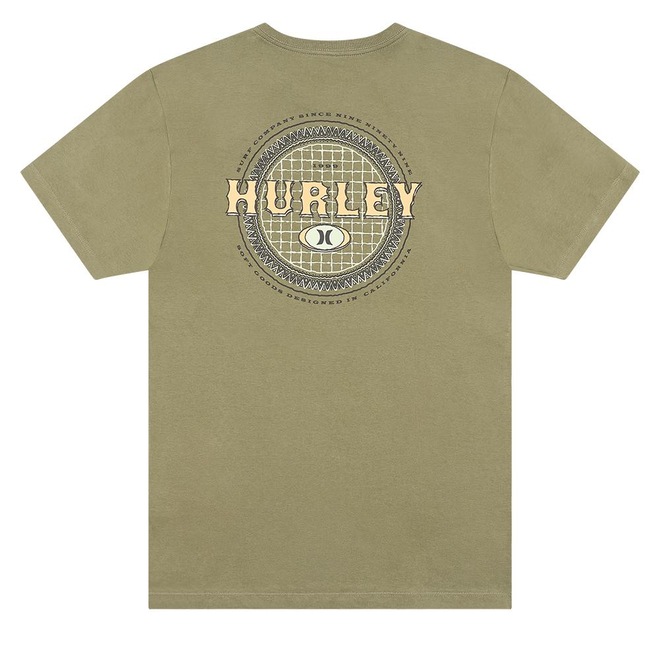 Camiseta Hurley feita em meia malha 30.1, gola rebatida, estampa localizada base d'agua e etiqueta clips ONE&ONLY na barra.