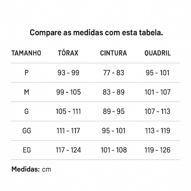 Tabela de Medidas (Tórax/Cintura/Quadril):