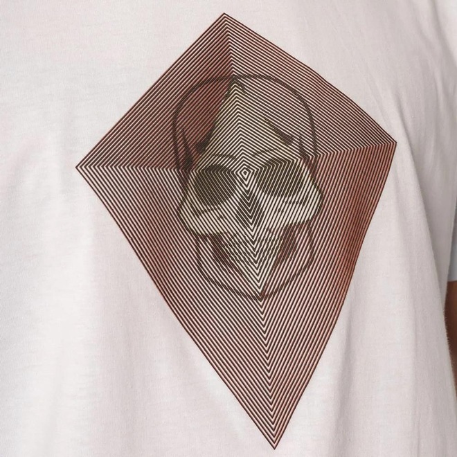 Camiseta Mcd feita em modelagem regular, estampa caveira em relevo, reforço de gola, etiqueta bandeira embutida na lateral e tag personalizado MCD.