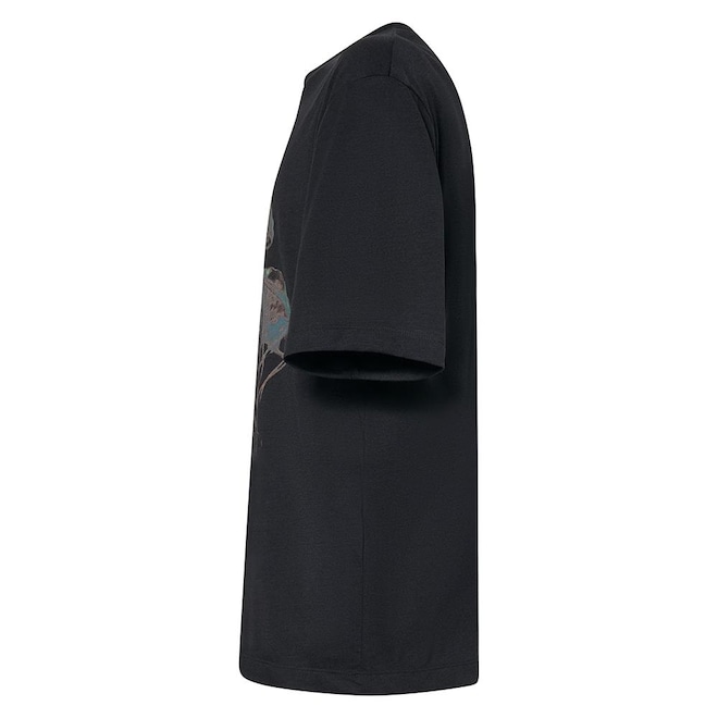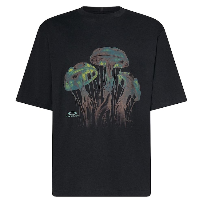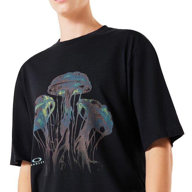 Camiseta Oakley feita em modelagem quadrada, modelagem relax, gola redonda canelada, arte estampada na frente, assinatura EPL (Loop de Proteção de Óculos) na parte de trás e 150 gr.