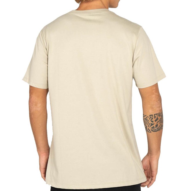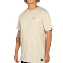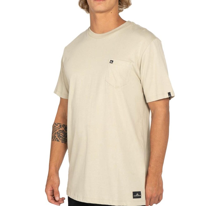 Camiseta QuikSilver feita em modelagem regular fit, meia malha, bolso frotal com etiqueta aplicada e etiqueta da marca aplicada na manga do lado esquerdo de quem veste.