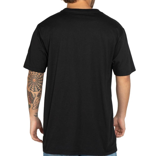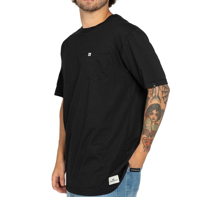 Camiseta QuikSilver feita em modelagem regular fit, meia malha, bolso frotal com etiqueta aplicada e etiqueta da marca aplicada na manga do lado esquerdo de quem veste.