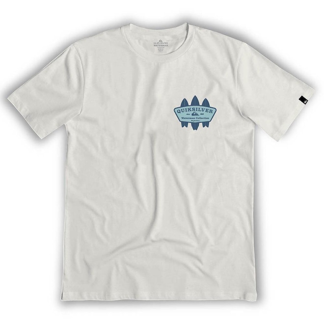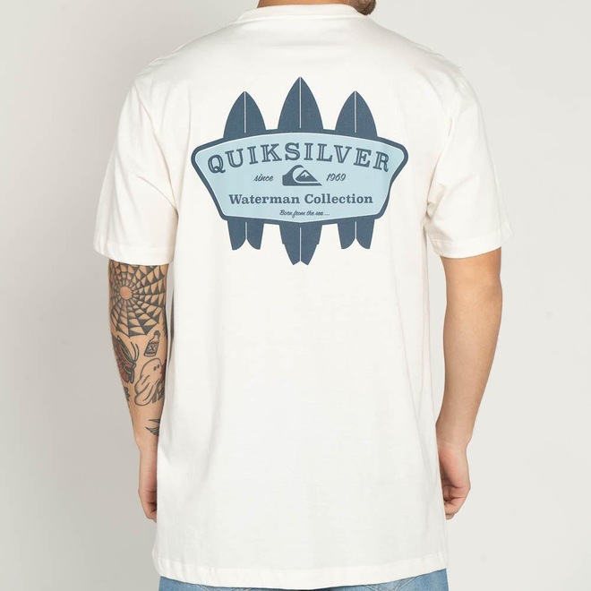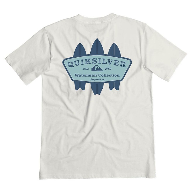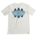 Camiseta QuikSilver feita em modelagem regular fit, meia malha, estampa aplicada na frente e nas costas e etiqueta da marca aplicada na manga do lado esquerdo de quem veste.