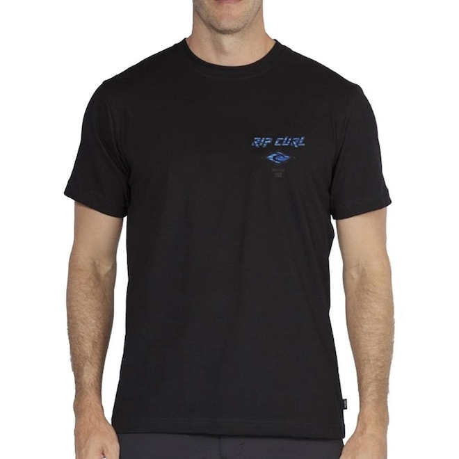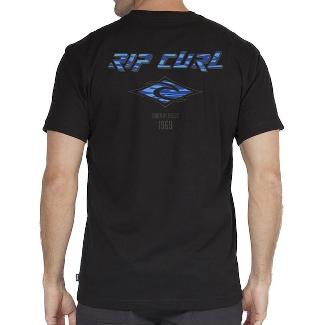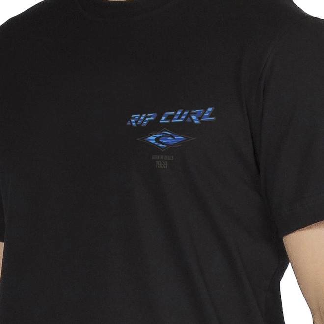 Camiseta Rip Curl feita em modelagem relaxed fit big blokes, meia malha 26.1 penteada, estampa frente e costas.