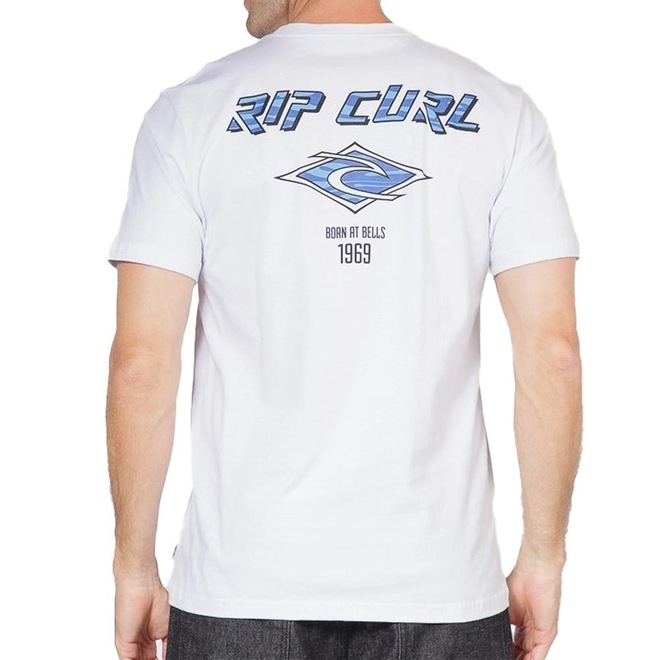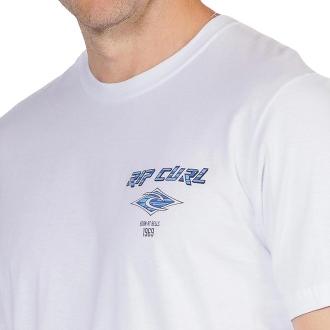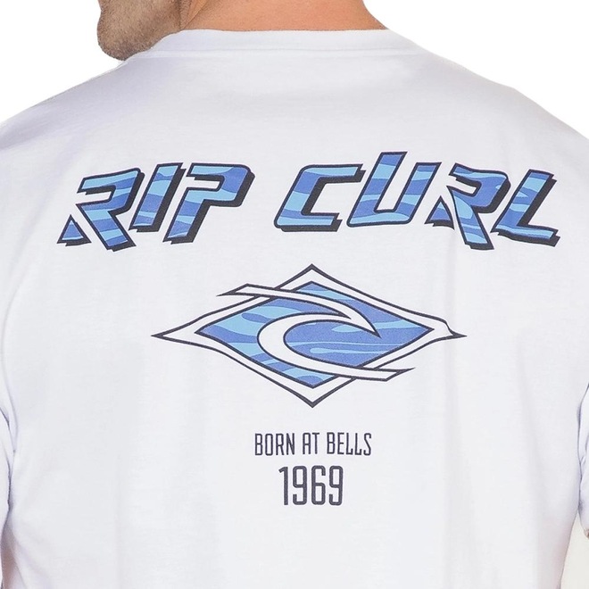 Camiseta Rip Curl feita em modelagem relaxed fit, meia malha 26.1 penteada, estampa frente e costas e etiquetas personalizadas.