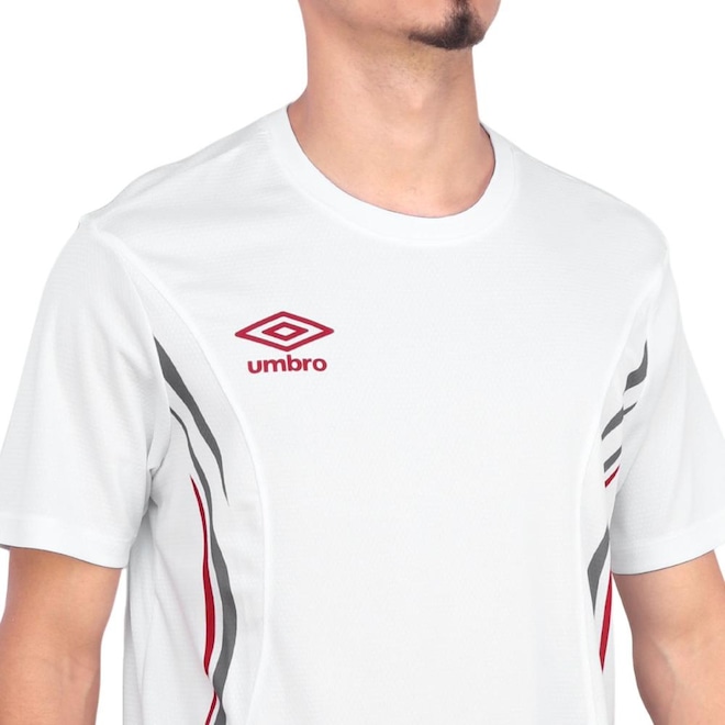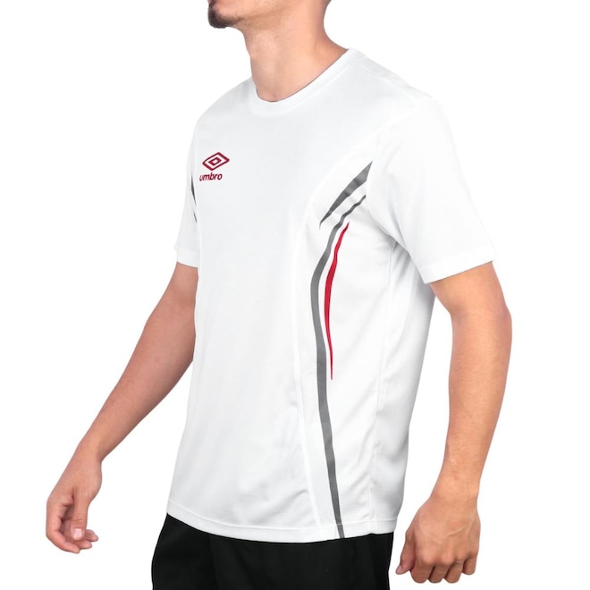 - Detalhamento: Camisa manga curta, gola careca, logo Umbro na altura do peito ao lado direito. Possui faixas verticais em cinza e vermelho nas laterais, que criam um efeito dinâmico e moderno, valorizando o caimento atlético da peça e reforçando seu estilo esportivo, tecido leve, respirável e resistente, com caimento tradicional;