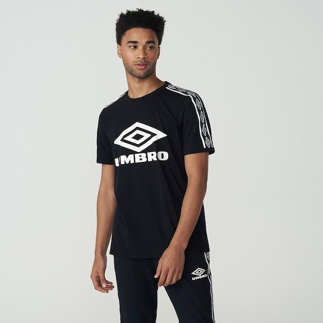 Camiseta masculina confeccionada em malha de algodão com elastano. Modelagem regular com gola careca em ribana e manga curta. Possui tape Umbro personalizado nas mangas, cobre gola com tape personalizado e maxi logo Umbro em silk centralizado na parte frontal superior.ref: M113T5