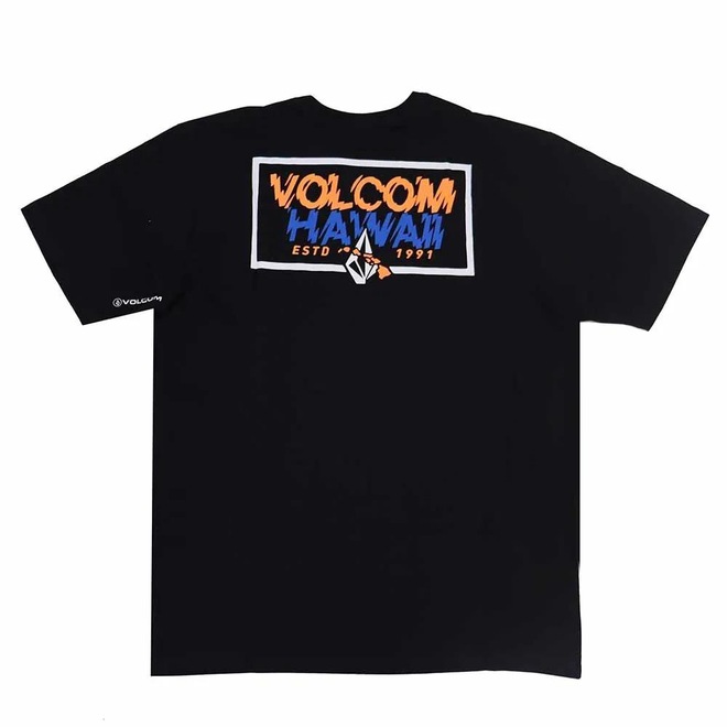 Camiseta Volcom feita em modelagem regular, meia malha 30.1, silk frente e costas, assinatura Volcom na manga, etiqueta interna e viés contrastante.