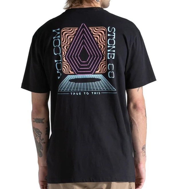 Camiseta Volcom feita em modelagem regular, meia malha 30.1, silk frente e costas, assinatura Volcom na manga, etiqueta interna e viés contrastante.