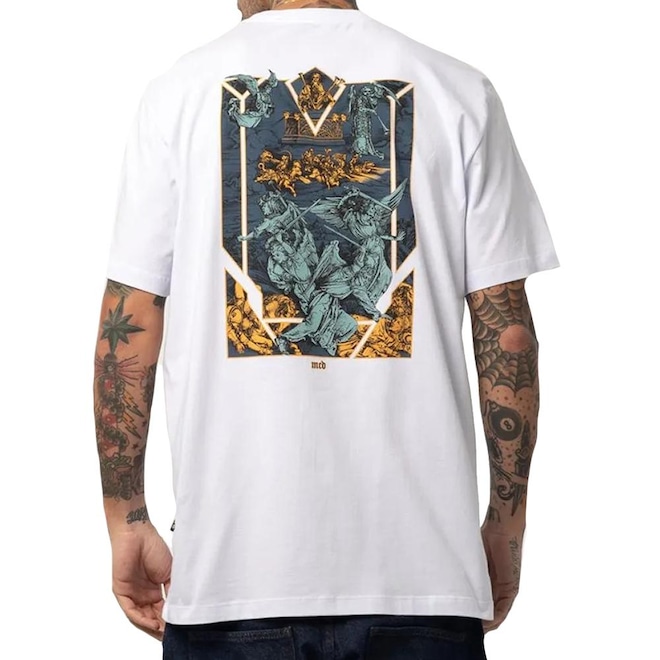 Camiseta Mcd feita em modelagem regular, estampa frontal silk zero toque cavaleiro 4, estampa costas grande 4 anjos, reforço de gola, etiqueta bandeira embutida na lateral e tag personalizado MCD.
