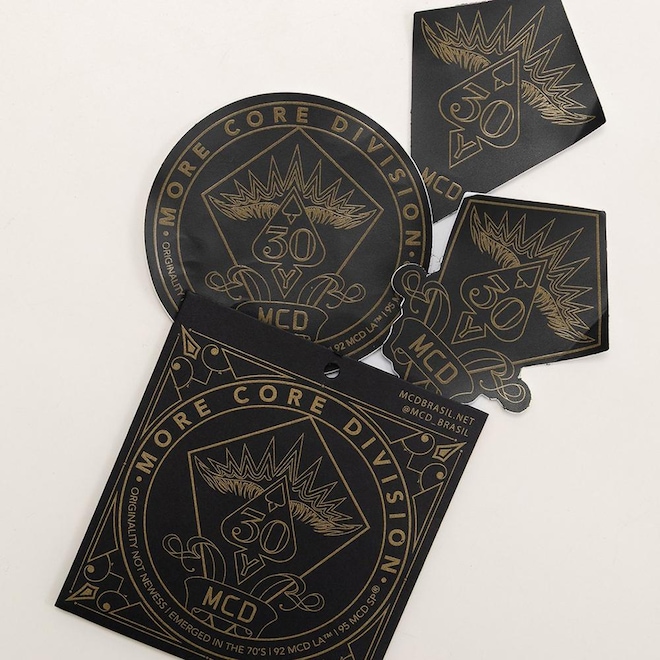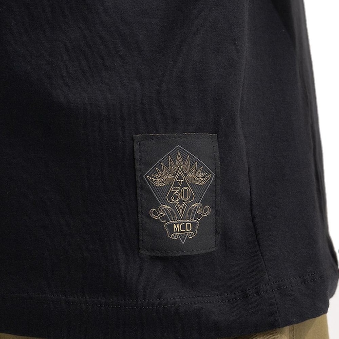 Camiseta Mcd feita em modelagem regular, malha 150g, estampa frontal espada localizada no centro, reforço de gola, etiqueta bordado externa acima da barra costas, etiqueta espada aplicada na gola e tag especial com adesivos MCD 30 Anos.