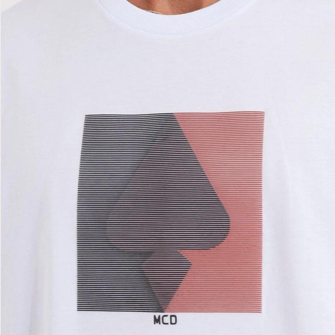 Camiseta Mcd feita em modelagem regular, estampa MCD em relevo, reforço de gola, etiqueta bandeira embutida na lateral e tag personalizado MCD.