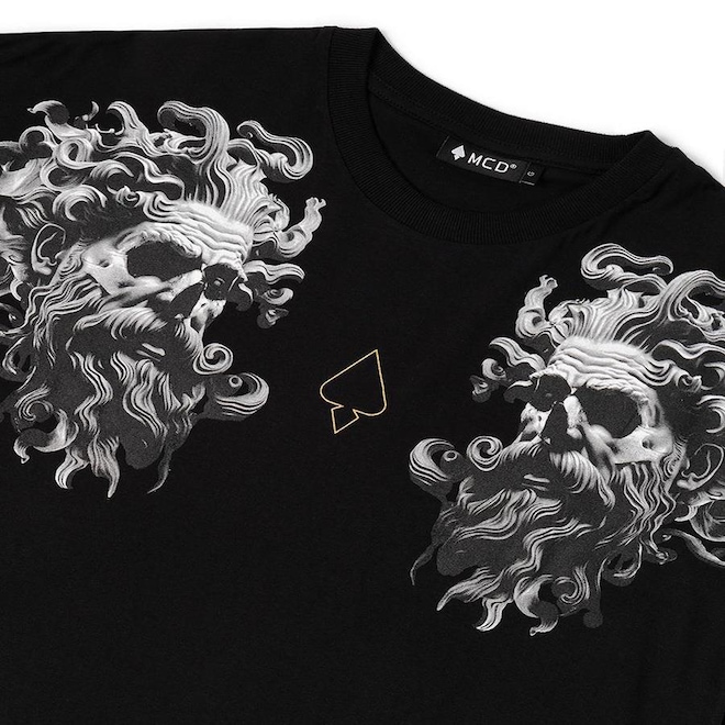 Camiseta MCD em malha penteada 30/1, estampa frontal, modelagem regular e etiquetas personalizadas.