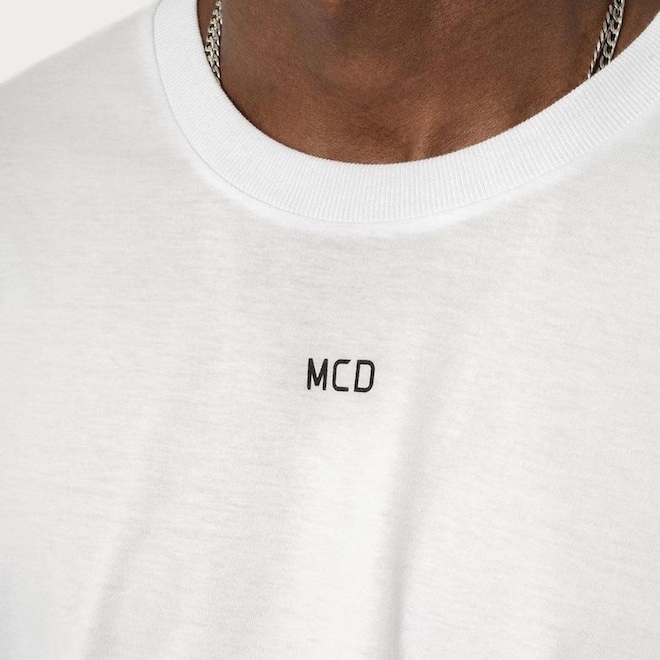 Camiseta MCD feita em malha penteada 30.1, estampa localizada na manga esquerda de quem veste e etiquetas personalizadas.