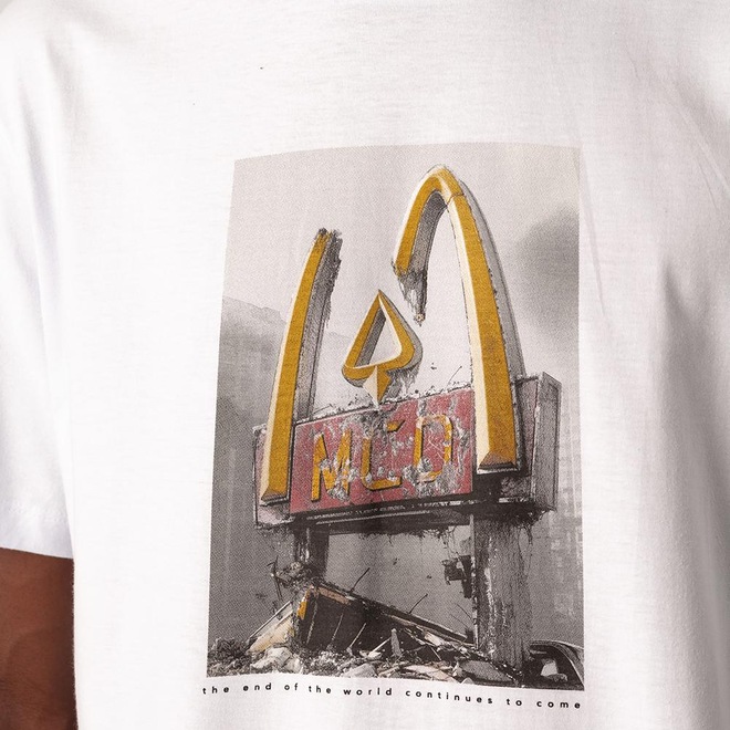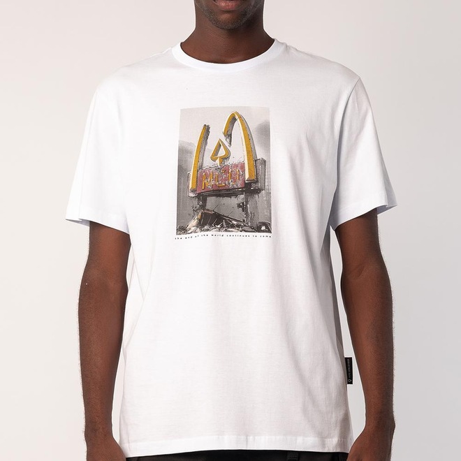 Camiseta Mcd feita em modelagem regular, malha 150g, estampa frontal e etiquetas personalizadas.