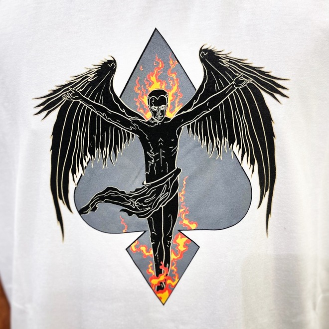 A estampa apresenta um anjo envolto em chamas, simbolizando força, proteção e atitude.