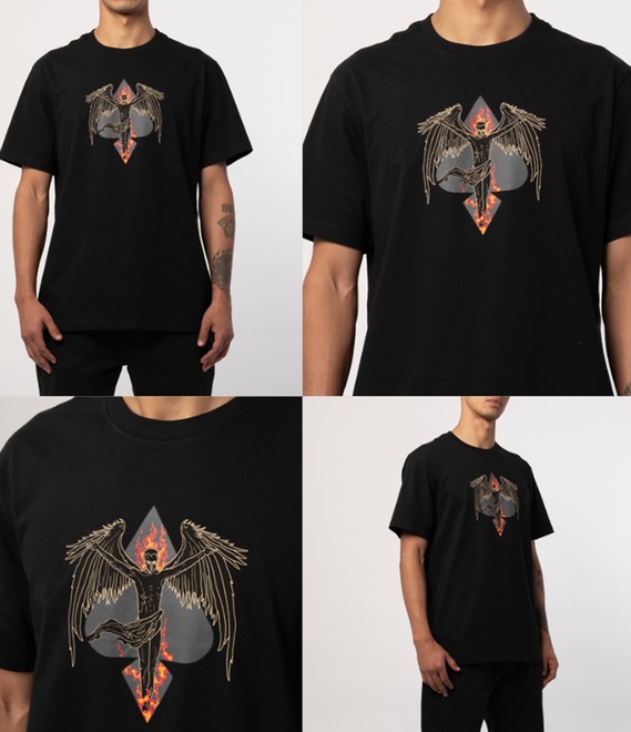 A estampa apresenta um anjo envolto em chamas, simbolizando força, proteção e atitude.