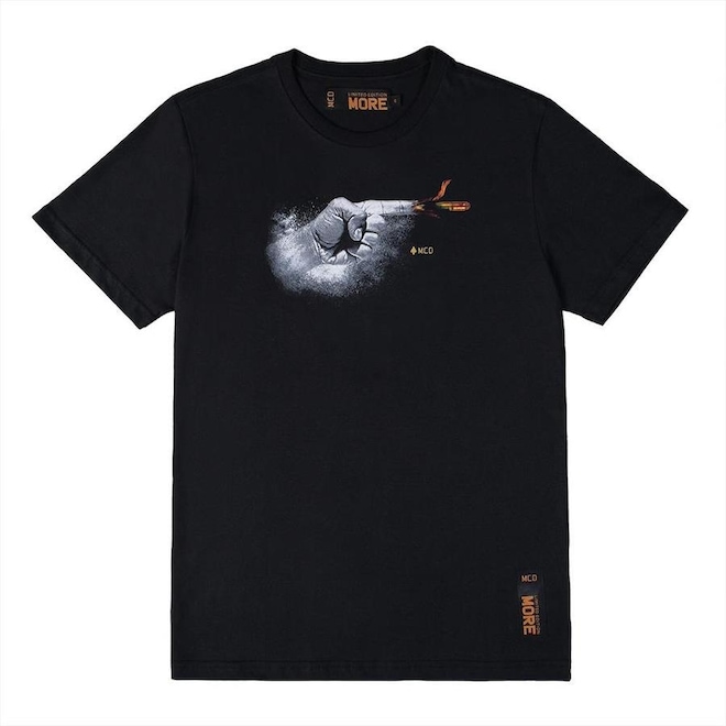 Camiseta MCD feita em malha penteada 30.1, estampa frontal e etiquetas personalizadas.