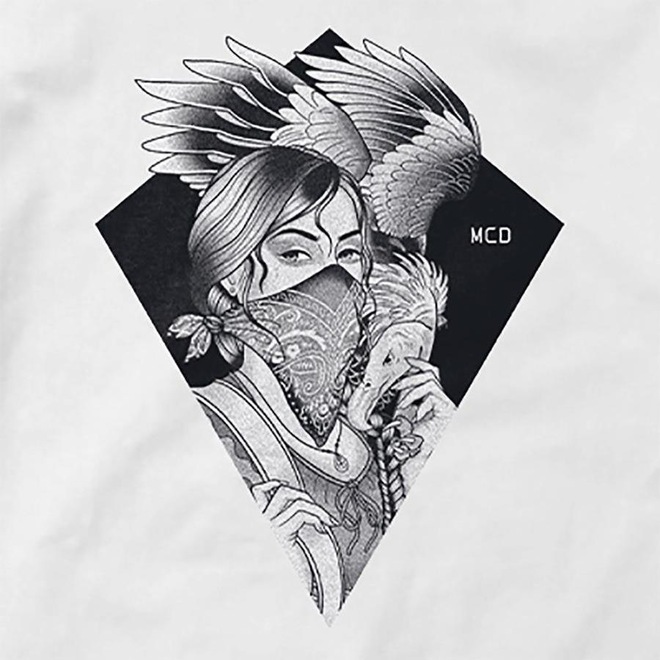 Camiseta MCD com malha penteada 30.1 silk frontal, silk frontal, modelagem regular e etiqueta personalizada.