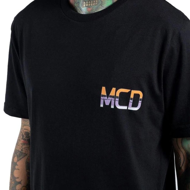 Camiseta MCD com meia malha penteada, fio 30/1, estampa frontal e traseira, modelagem regular e etiquetas personalizadas.
