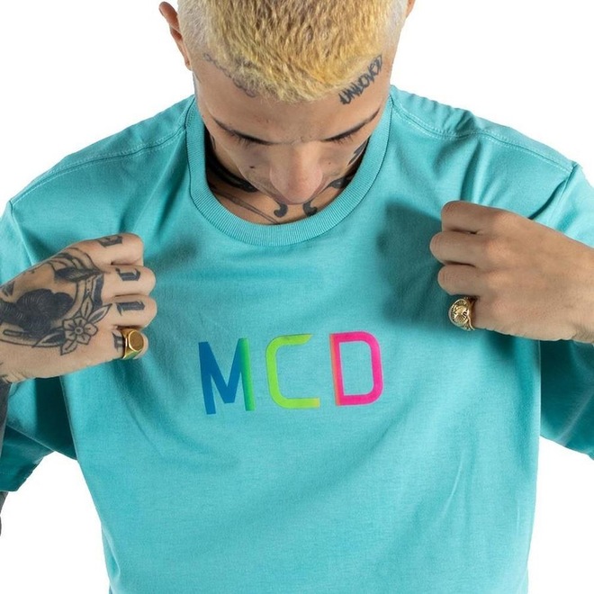 Camiseta MCD com malha penteada 30.1 silk frontal que acende quando exposto à luz, estampa traseira, modelagem regular e etiqueta personalizada na lateral.