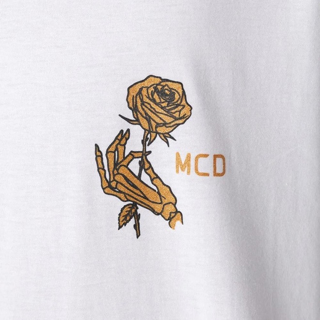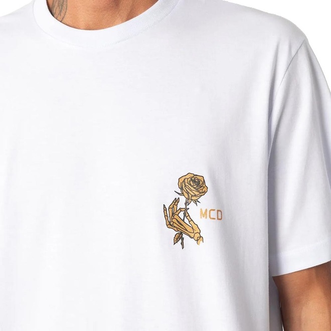 Camiseta MCD feita em malha penteada 30.1, estampa no peito e etiquetas personalizadas.