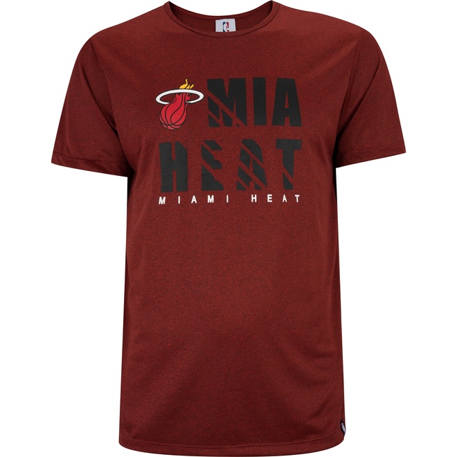 A camiseta Miami Heat masculina é de mangas curtas, com gola careca.