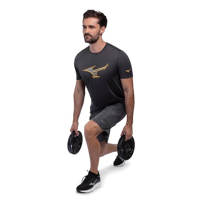 T-shirt em malha leve de poliéster, com mangas curtas e modelagem regular. O diferencial da peça está na estampa exclusiva Mizuno para um look diferenciado para o seu treino.